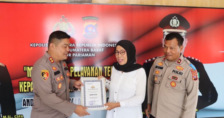 Pariaman — Kapolres Pariaman, AKBP Andreanaldo Ademi, S.H., S.I.K., menyerahkan penghargaan kepada Ibu Fatmi Yeti, atau yang lebih dikenal dengan nama Teta Sabar, seorang perempuan yang selama hampir dua dekade konsisten menjadi penggerak dan pendamping bagi korban tindak asusila serta anak-anak yang berhadapan dengan hukum di Kota Pariaman.